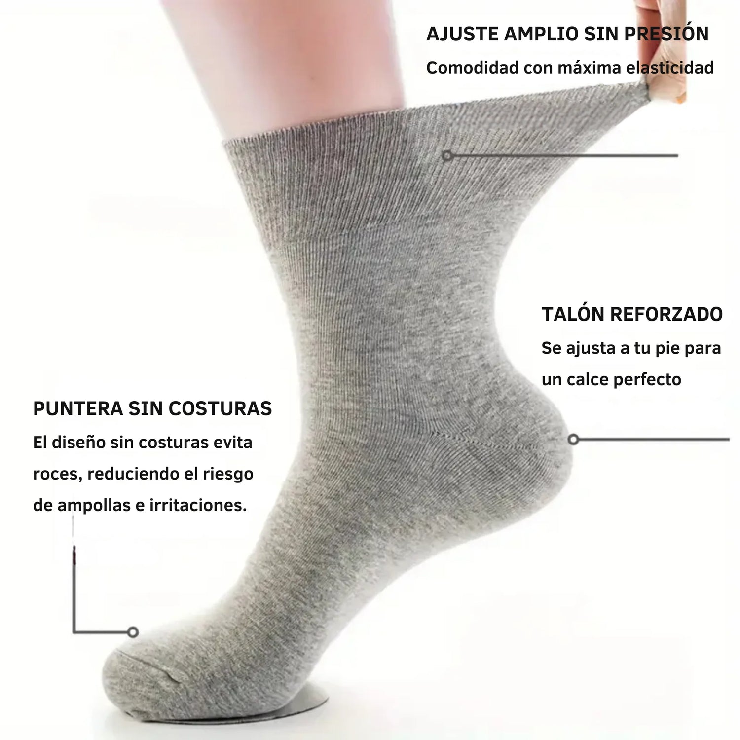 Puedes estar tranquilo: nuestro diseño sin compresión y su tejido de bambú natural protegen tus pies sin apretar.