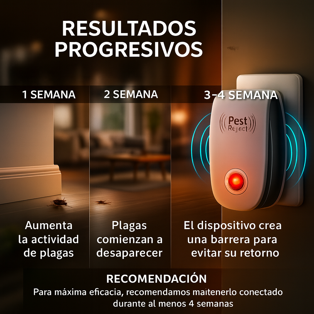 El dispositivo emite frecuencias ultrasónicas que varían automáticamente. Estas ondas afectan el sistema auditivo y nervioso de las plagas, creando un entorno hostil para ellas. En las primeras semanas notarás más actividad a medida que buscan salir; a partir de la tercera semana actúa como barrera para que no regresen.