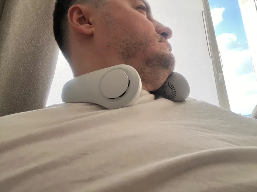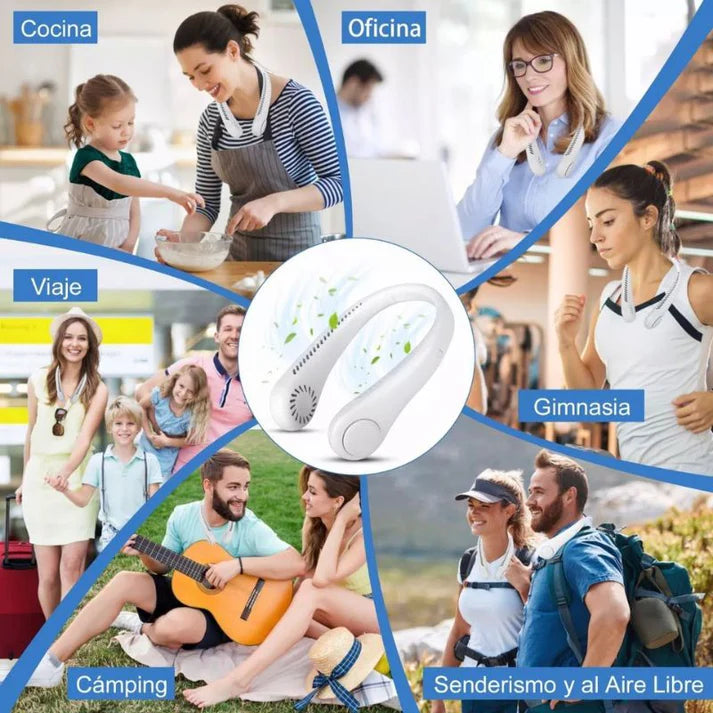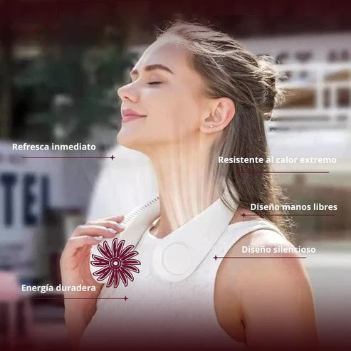 Nuestro ventilador de cuello sin aspas te ofrece un flujo de aire de 360°,silencioso y constante, que te acompaña a donde vayas. Solo póntelo y siente alivio inmediato en cuello, cara y cabeza.